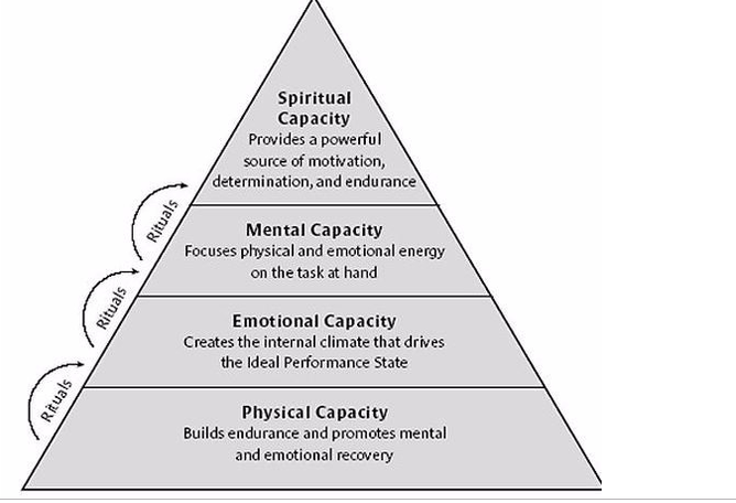 Each level must be addressed in order for the individual to reach their ideal performance state and to sustain it over the long run. Rituals can help provide the framework or structure necessary to both expend and recover energy as required to keep a balanced mind and body and to operate at full capacity.