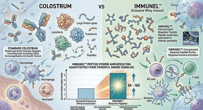 Immunel® is a low molecular weight bioactive peptide fraction isolated from colostrum whey. Rather than delivering the entire colostrum matrix, it concentrates specifically the immune-signalling peptides — the fraction responsible for the rapid activation of innate immune cells.